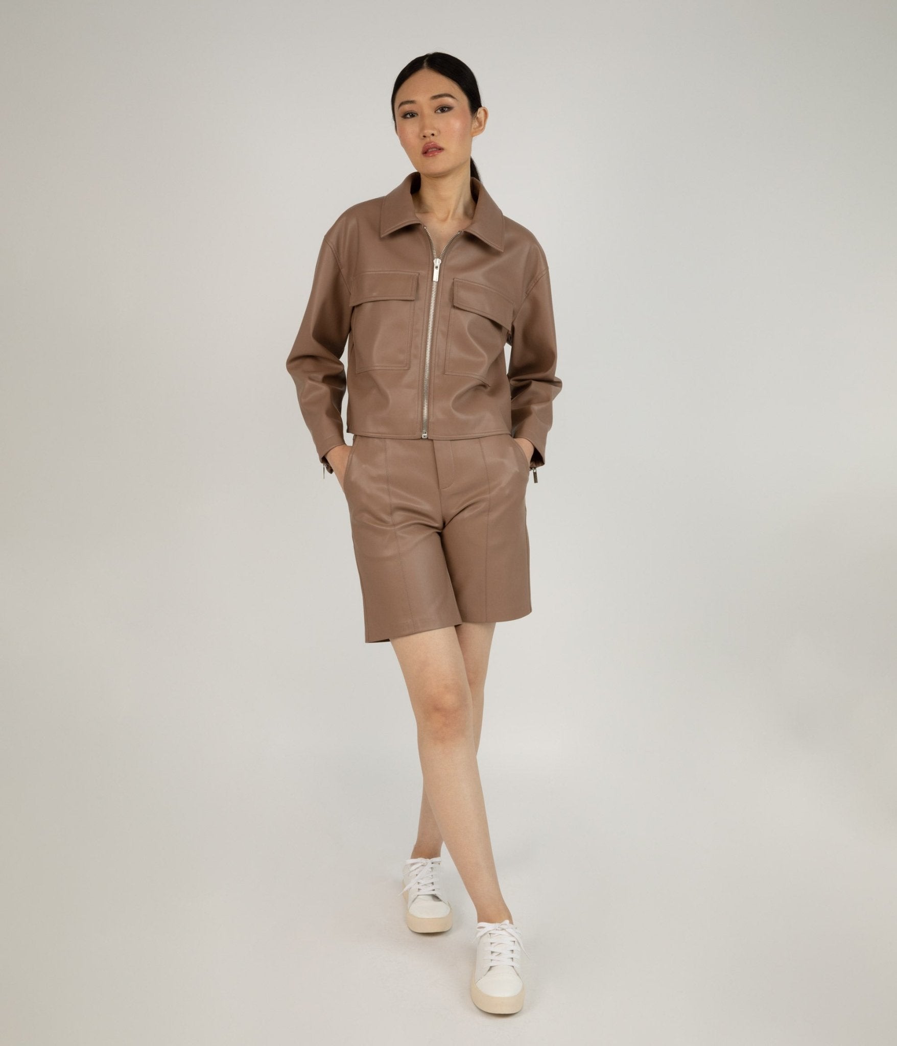 Veste à manches longues en PU souple avec fermeture zippée sur le devant et col italien, épaules descendues, grandes poches à rabat sur la poitrine et poignets zippés. Coupe surdimensionnée