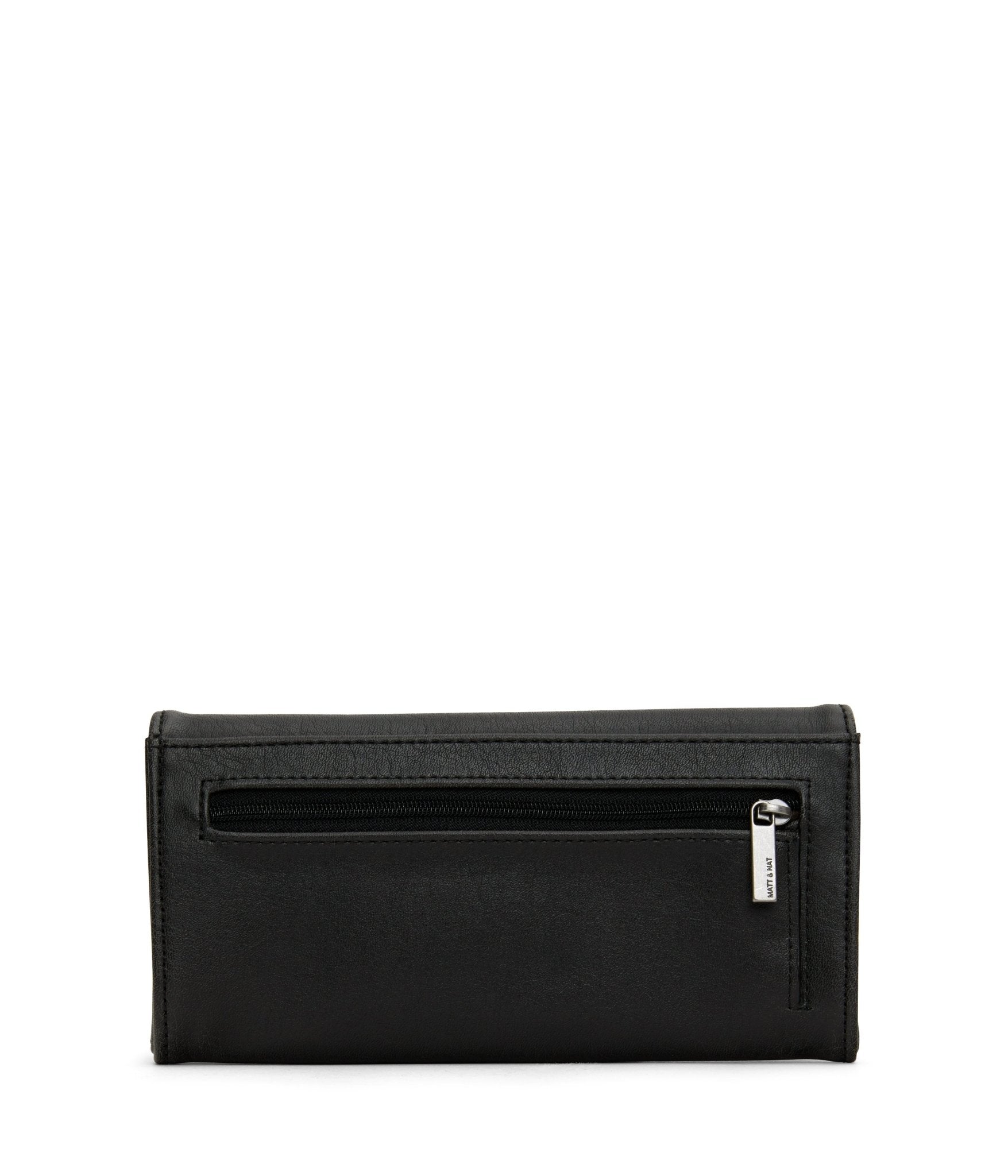 Portefeuille avec fermeture à bouton-pression et poche à monnaie zippée à l'extérieur du dos.