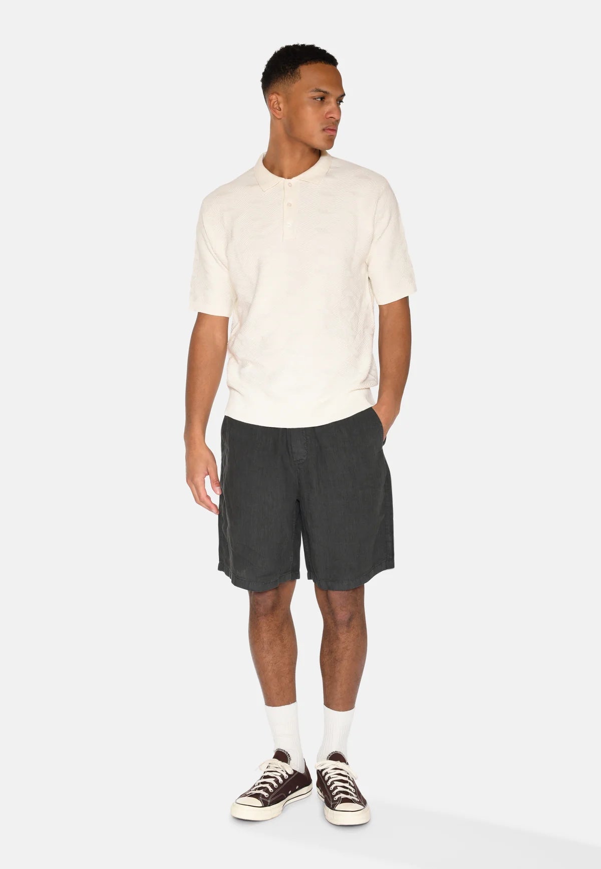 La chemise est détaillée avec un col polo classique, une fermeture discrète à boutons et des bords côtelés, qui ensemble créent une silhouette nette et élégante. La coupe décontractée la rend idéale à la fois pour des looks décontractés et plus habillés, et elle est parfaite pour les journées plus chaudes lorsque vous souhaitez tout de même avoir une allure soignée.