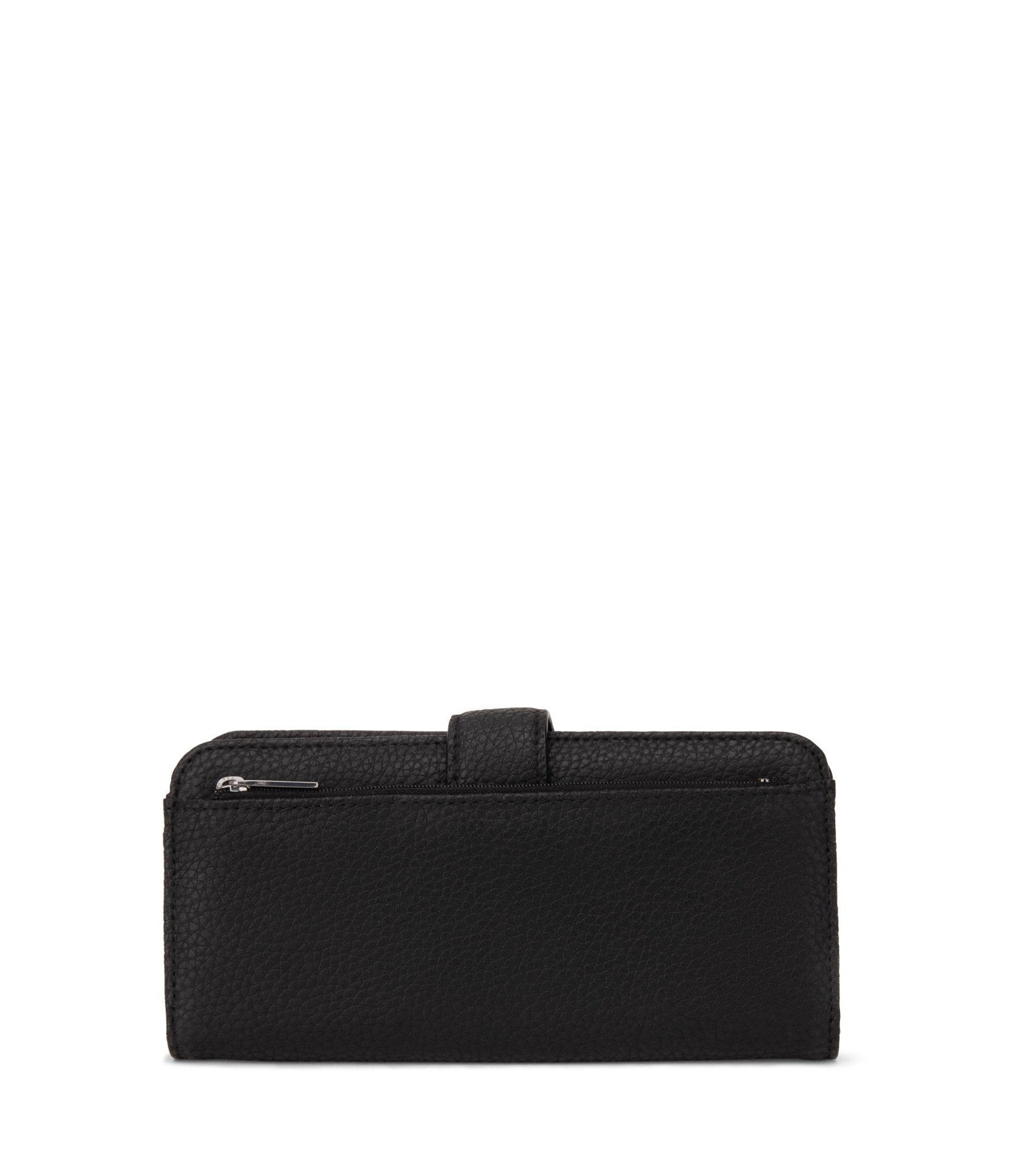 Folded wallet with a tab closure and a zipper pocket at back. The outer body and lining of the Purity collection are made from recycled materials.All of the interior linings of our bags are made from 100% recycled plastic bottles.